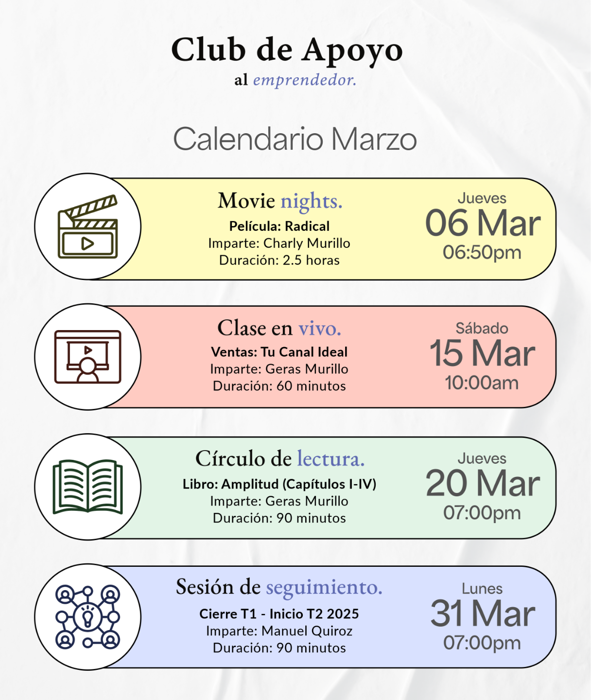 4 sesiones en vivo al mes. Te unes a las que puedas.